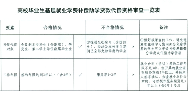 根据《高等学校毕业生学费和国家助学贷款代偿暂行办法》(财教[2009]15号)、《关于调整完善国家助学贷款相关政策措施的通知》(财教[2014]180号)有关规定,国家对中央部门所属全日制普通高等学校应届毕业生,自愿到中西部地区和艰苦边远地区基层单位就业、服务期达到3年以上(含3年)的,实施相应的学费和国家助学贷款代偿。学生毕业后每年代偿学费或国家助学贷款的最高金额不超过8000元(按实际的学费和贷款金额计算),分三年代偿完毕,将本次补偿代偿申请材料报送有关事项通知如下: