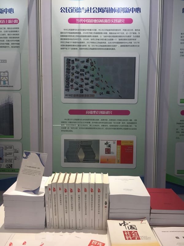 (1)当代中国道德国情调查实践研究成果针对公民道德与社会风尚建设中的重大问题,中心与江苏省宣传部深度协同,开展立足江苏、面向全国的当代中国道德国情调查。2016年开展江苏道德国情大调查,覆盖全省248个社区、近一万户家庭。与前期调查共同形成江苏和全国道德发展两大数据库、以“当前中国伦理道德发展的共识与差异”为主题道德发展报告48份约400万字。2016年,协同江苏省文明办建立全国第一个“道德发展状况测评体系”,并在江苏省13个地级市全面测评。2017年联合江苏省宣传部、北京大学中国国情研究中心开展“2017年全国伦理道德发展状况调查与研究”和“2017年江苏省道德发展状况测评”。道德国情研究成果在社会各界产生了广泛的影响,受到中央和江苏省委相关领导同志的重视和嘉奖。此次集中展出了中国伦理道德发展数据库(2005-2017)、江苏伦理道德发展数据库(2005-2017)、伦理道德发展的共识与差异数据库、中国社会的组织伦理状况(深度访谈)信息库等10余个数据库与近千万字的信息库;《伦理道德发展的时序与地域差异(上下编)》、《诸社会群体伦理道德发展差异报告》等48份调查报告。
