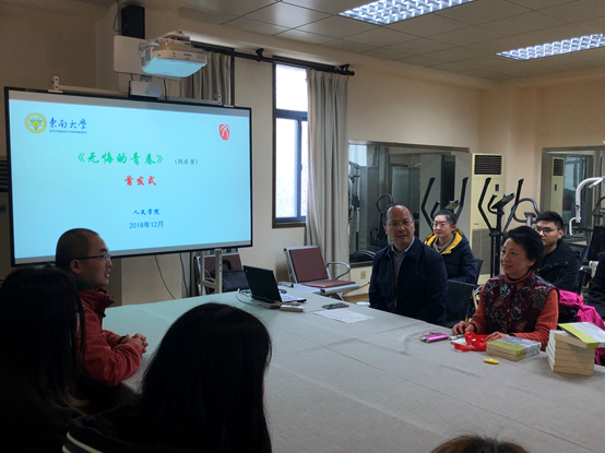 2018年12月5日中午,在东大九龙湖校区必赢线路检测3003no1多功能室,必赢线路检测3003no1党委与学院关工委、学院退协分会联合举办了新书《无悔的青春》这部长篇小说的首发式。学院党委书记兼关工委主任李涛、学院党委副书记兼关工委副主任何熠、秘书蔡小萍、学院关工委副主任和退协分会理事长闵卓与低年级学生党支部(本科大一到大三)全体20多位青年同学一起欢乐聚会,举办了《无悔的青春》(闵卓/著)首发式,同时举行该书给学院图书馆的捐赠仪式。同学们拿到这本新书,都立即翻阅起来,有的同学甚至凝心聚神地精读某些篇章。