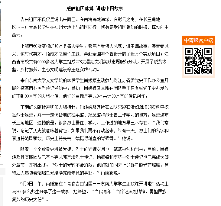 9月20日,中国青年网在《3800多万高校学子“花样”告白—“我爱你,我的祖国》一文中对必赢官网2018本科生肖媛媛同学及其所在的暑期社会实践团队“青年红色筑梦之旅实践团”进行报道。