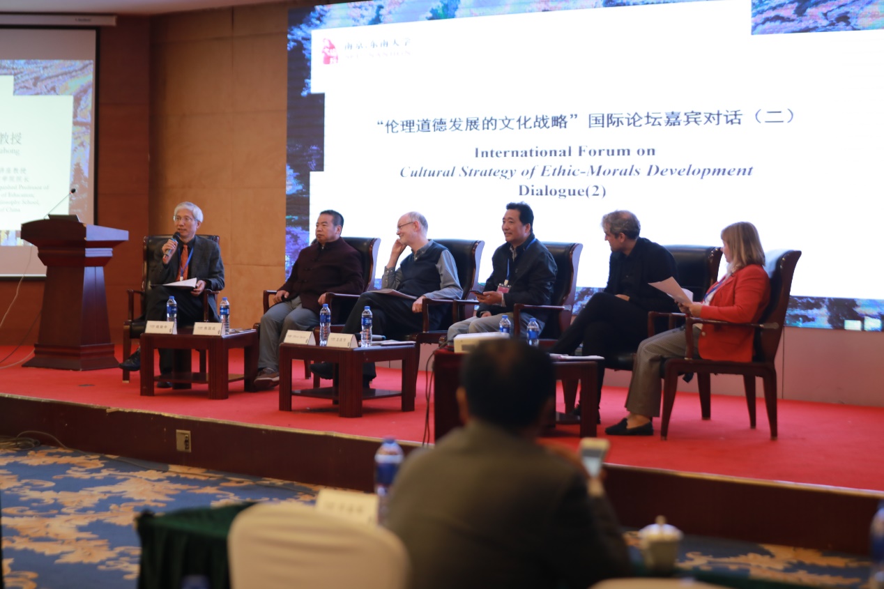 在国际论坛的嘉宾对话环节,香港中文大学黄勇教授探讨了古代儒家对当代美德伦理的贡献问题,涉及到德性论对康德主义的批判、美德的定义等。莫斯科大学的Alexander Chumakov教授就哲学的时代定位问题展开发言,面对核技术危机、克隆技术、全球化等时代性问题,哲学是否还具有绝对价值,哲学如何更好的对人类生活发生作用。中山大学李萍教授对东大伦理学团队给予高度评价,认为其具有三重革命性意义——开放精神、面向世界和人类、研究方法革命。韩国交通大学洪容熹教授对中国传统伦理和韩国现代社会间的关系进行了解读,认为孔子的金规则和仁爱思想在当今生活中仍然具有正面意义,但是同时也存在裙带关系主义等问题。澳门大学王庆节教授重新解读了共同体的三个概念及其哲学意义,分别是观念论的界定式共同体、契约论共同体和生命交合共生共同体。伦敦国王学院的Oliver Davies教授就现代的“新启蒙”问题展开讨论,聚焦于三个方面的主题:人只是宇宙的一部分、人是社会性动物、意识和身体关联紧密。中国人民大学焦国成教授对新时代的身份伦理进行剖析,随着传统社会的转型和高科技的发展,人应该思考如何重新锚定自己的身份,比如人与机器(人工智能)的关系、人类之间的爱等,并对建设人类命运共同体提出展望。维也纳大学Hans Bemhard Schmid教授对“伦理道德”这一话语进行历史回溯和中西比较,对西方伦理学的后果主义、义务论和德性论几大流派进行了梳理对比,针对伦理学面临的困境提出存在主义的主张。两场对话分别由必赢线路检测3003no1郭广银教授和中国人民大学姚新中教授主持,由浙江师范大学李建华教授和莫斯科国立大学Tatiana L.Shestova教授作精彩点评。