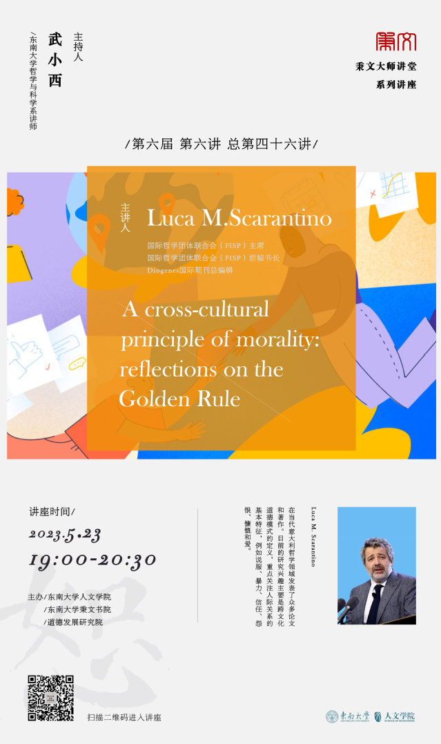 主讲人简介:Luca M.Scarantino,国际哲学团体联合会(FISP)主席(2018-2023),国际哲学团体联合会(FISP)前秘书长(2008-2018),Diogenes国际期刊总编辑。Luca M.Scarantino教授在当代意大利哲学领域发表了众多论文和著作。目前的研究兴趣主要是跨文化道德模式的定义,重点关注人际关系的基本特征,例如说服、暴力、信任、怨恨、慷慨和爱。2018年,世界哲学大会首次来到中国。作为国际哲学团体联合会(FISP)前秘书长,Luca M.Scarantino教授出任2018年第二十四届世界哲学大会执行委员会主席,成功推动并组织本届世哲会的圆满召开。同时本届会议选举Luca M.Scarantino教授为新一任国际哲学团体联合会主席。
