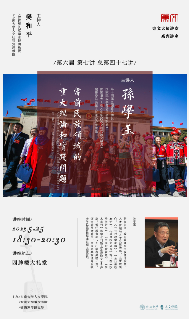 主讲人简介:孙学玉,第十四届全国政协委员、国家民族事务委员会专职委员、国家重大工程《中华民族交往交流交融史》编纂委员会副主任兼办公室主任。研究方向:政府管理与民族理论政策、人才管理与人才发展战略。主要代表作:《公共行政学论稿》、《企业型政府论》、《垂直权力分合》等;在《政治学研究》、《中国行政管理》、《学术季刊》等学术刊物上发表论文100多篇。曾任全国公共管理专业硕士学位教育指导委员副主任委员。