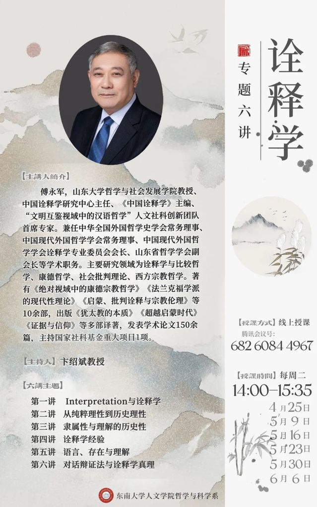 傅永军,山东大学哲学与社会发展学院教授、中国诠释学研究中心主任、《中国诠释学》主编、“文明互鉴视域中的汉语哲学”人文社科创新团队首席专家。兼任中华全国外国哲学史学会常务理事、中国现代外国哲学学会常务理事、中国现代外国哲学学会诠释学专业委员会会长、山东省哲学学会副会长等学术职务。主要研究领域为诠释学与比较哲学、康德哲学、社会批判理论、西方宗教哲学。著有《绝对视域中的康德宗教哲学》《法兰克福学派的现代性理论》《启蒙、批判诠释与宗教伦理》等10余部,出版《犹太教的本质》《超越启蒙时代》《证据与信仰》等多部译著,发表学术论文150余篇,主持国家社科基金重大项目1项。