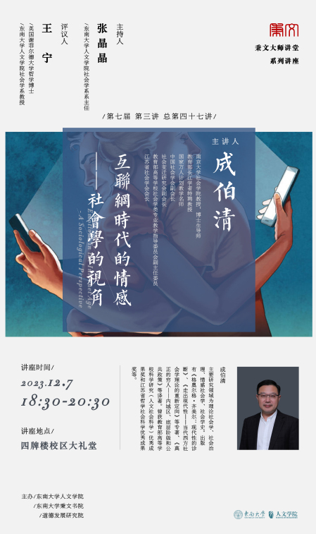 本期秉文大师讲堂邀请到南京大学社会学院教授、博士生导师成伯清教授作题为《互联网时代的情感——社会学的视角》的学术讲座。